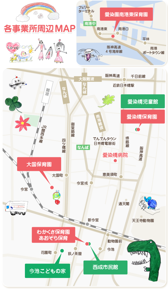 大阪市浪速区日本橋東。自由保育、障がい児保育、延長保育、子育て相談、学童保育です。