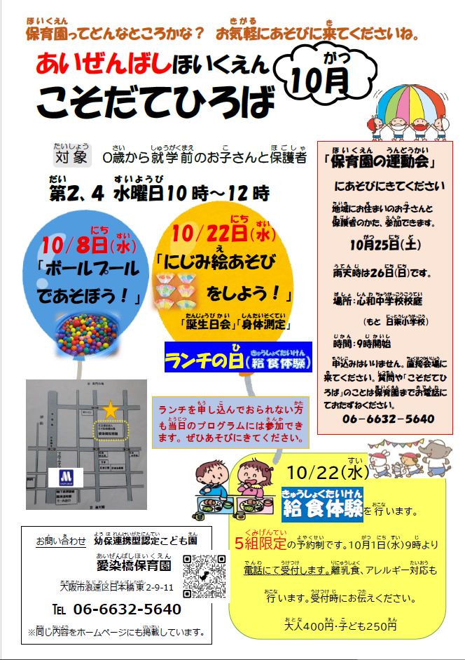 Date 2025.9.30 愛染橋保育園|子育て広場10月のご案内 This entry was posted in 愛染橋保育園. Bookmark the permalink. ← 西成市民館「ほのぼの通信」2025年9月号 今池こどもの家ニュース 2025年10月号 → カテゴリ 新着ニュース 愛染橋保育園 わかくさ保育園 大国保育園 南港東保育園 愛染橋児童館 今池こどもの家 西成市民館 イベントのお知らせ ほのぼの通信 あいあい広報誌 関連リンク 石井記念愛染園総合トップ 医療事業トップ 隣保事業トップ 介護事業トップ