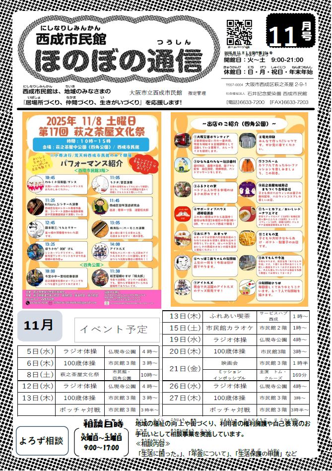 Date 2025.11.4 西成市民館「ほのぼの通信」2025年11月号 西成市民館「ほのぼの通信」11月号を発行しました ↓クリックするとPDFページが開きます。 This entry was posted in ほのぼの通信. Bookmark the permalink. ← 今池こどもの家ニュース 2025年11月号 南港東保育所|2025年度 ちびっこクラブ11月・12月の予定 → カテゴリ 新着ニュース 愛染橋保育園 わかくさ保育園 大国保育園 南港東保育園 愛染橋児童館 今池こどもの家 西成市民館 イベントのお知らせ ほのぼの通信 あいあい広報誌 関連リンク 石井記念愛染園総合トップ 医療事業トップ 隣保事業トップ 介護事業トップ