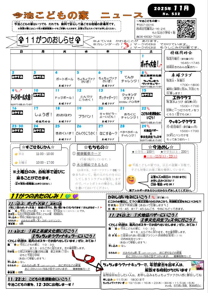 Date 2025.11.1 今池こどもの家ニュース 2025年11月号 This entry was posted in 今池こどもの家. Bookmark the permalink. ← 11月2日(日)開催の「 ほいコレ就職フェア」ぜひお越しください‼ 西成市民館「ほのぼの通信」2025年11月号 → カテゴリ 新着ニュース 愛染橋保育園 わかくさ保育園 大国保育園 南港東保育園 愛染橋児童館 今池こどもの家 西成市民館 イベントのお知らせ ほのぼの通信 あいあい広報誌 関連リンク 石井記念愛染園総合トップ 医療事業トップ 隣保事業トップ 介護事業トップ
