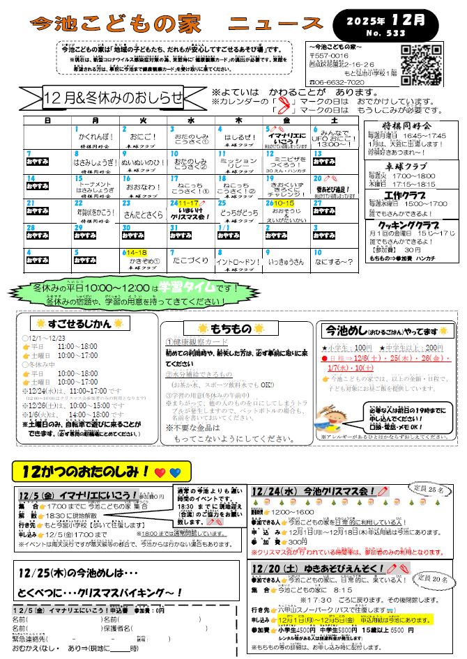 Date 2025.12.1 今池こどもの家ニュース 2025年12月号 This entry was posted in 今池こどもの家. Bookmark the permalink. ← 愛染橋保育園|子育て広場12月のご案内 西成市民館「ほのぼの通信」2025年12月号 → カテゴリ 新着ニュース 愛染橋保育園 わかくさ保育園 大国保育園 南港東保育園 愛染橋児童館 今池こどもの家 西成市民館 イベントのお知らせ ほのぼの通信 あいあい広報誌 関連リンク 石井記念愛染園総合トップ 医療事業トップ 隣保事業トップ 介護事業トップ