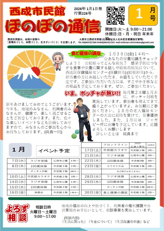 Date 2026.1.1 西成市民館「ほのぼの通信」2026年1月号 西成市民館「ほのぼの通信」1月号を発行しました ↓クリックするとPDFページが開きます。 This entry was posted in ほのぼの通信. Bookmark the permalink. ← 愛染橋保育園|子育て広場1月のご案内 カテゴリ 新着ニュース 愛染橋保育園 わかくさ保育園 大国保育園 南港東保育園 愛染橋児童館 今池こどもの家 西成市民館 イベントのお知らせ ほのぼの通信 あいあい広報誌 関連リンク 石井記念愛染園総合トップ 医療事業トップ 隣保事業トップ 介護事業トップ