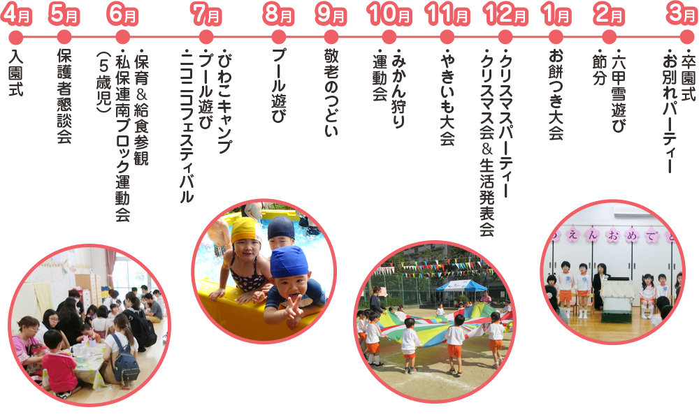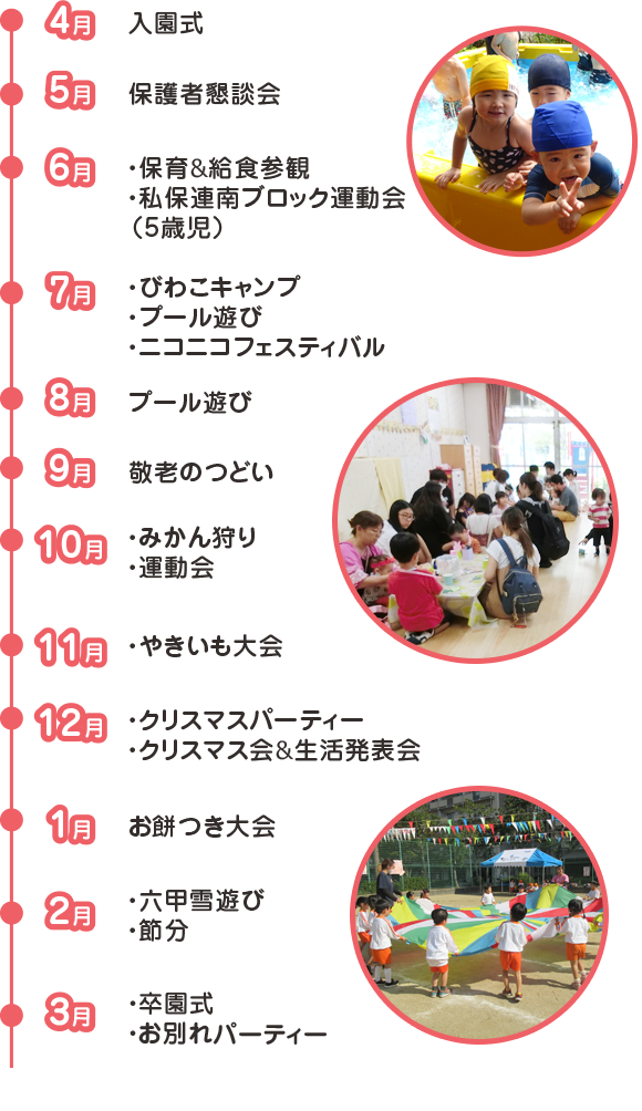 - 好きな遊びを楽しみます (力いっぱい遊び健康なからだと集中力や社会性を身につけます。)